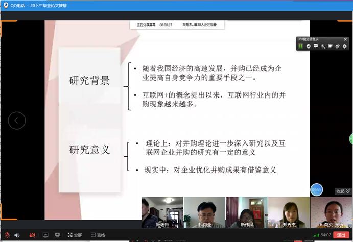 在答辩过程中,线上答辩严格遵循线下答辩的严质量高标准。首先,答辩组组长介绍答辩老师,宣读答辩流程,点名确定答辩员工到场,强调答辩纪律。随后,答辩员工汇报论文研究框架、研究内容、研究方法、研究结论、创新点和不足之处等。评委在听取员工陈述后,依次就论文选题、结构、内容和论文的规范性等方面提问和提出修改意见。本组员工全部答辩完成后,答辩组老师进行答辩评议并通告员工答辩结果。