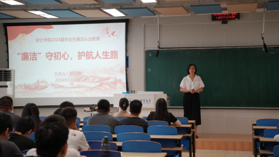 程丽梅为即将毕业离校的会院学子讲授《“廉洁”守初心,护航人生路》廉洁教育课,并为即将开启新征程的学子们送上毕业祝福和谆谆教诲。首先,她带领与会师生学习了习近平总书记关于党风廉政建设的重要讲话,告诫大家清廉是福,贪欲是祸,要时刻自重自省,严守纪法规矩,心有所畏,言有所戒、行有所止。然后,她列举了几起典型的财务人员违纪违法问题案例,起到了良好的以案警廉的效果。最后,她指出要躬身践廉,在思想上要不断提高思想政治素质和职业道德素养,在工作上要恪尽职守、严于律己、加强学习。在生活中要勤俭节约、艰苦朴素、珍惜拥有。