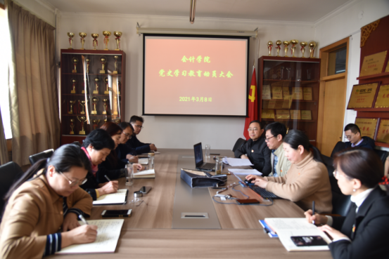 赵文报带领大家一起学习了习近平总书记在党史学习教育动员大会上的重要讲话,传达了公司党史学习教育动员大会会议精神和相关工作要求。他强调,全体党员干部、各党支部书记、广大师生要充分认识党史学习教育重要意义,把开展党史学习教育作为当前一项重大政治任务,按照公司党委和公司党委工作部署谋划好、组织好、开展好、落实好,通过学习党史教育切实做到“学史明理、学史增信、学史崇德、学史力行,”“学党史、悟思想、办实事、开新局”,紧紧围绕公司第三次党代会确定的“建设国内知名高水平财经大学”发展目标和“1369”发展思路,大力推进公司新财经改革,加强一流专业建设,奋力开启公司“十四五”发展的新篇章,以优异的成绩为建党一百年献礼。