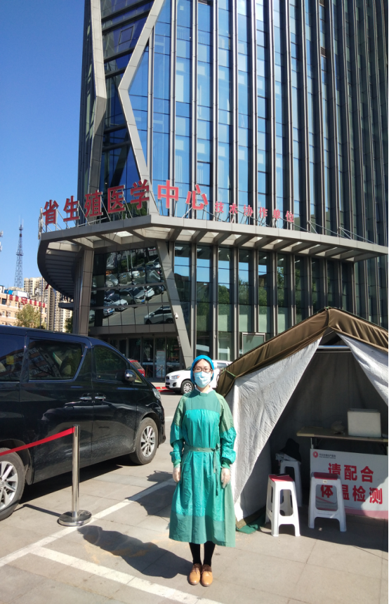 每天从早上7点半到下午6点,她在凛冽的寒风中坚守岗位,即使医院给配备暖水袋、暖贴也难以抵御寒冷的侵袭。但是无论多冷,她也要始终怀抱红外测温仪,因为它是工作中重要的“武器”,否则会由于室外温度过低而测不出正确的温度。防护装备穿脱一次大约需要半小时,为了能够完成值班任务,她坚持一上午或一下午不喝水、不去卫生间。工作一天下来,她的护目镜全是哈气,脸上是口罩勒出的印痕和捂出来的痘痘,还有在手套里泡的发白肿胀的双手。在预检分诊工作中,令她印象深刻的是碰到发热人员就诊。病人来时用紧张颤抖的声音说“医生,我发烧”,周边人员不由自主后撤一步,作为一线分诊工作人员的她挺身而出,主动向前一步,发放外科口罩,询问接触史及发热症状并登记,测量体温并立刻联系医护人员隔离。最终虚惊一场,经医生诊断仅是普通感冒发烧。还有一次,她在医院门口遇到一位突然晕厥的小女孩,看着父母无助的呼喊着孩子的名字,“跟我来”,她积极引导父母抱起孩子紧急送往急诊科,联系儿科主任下来紧急救治,最终女孩转危为安。