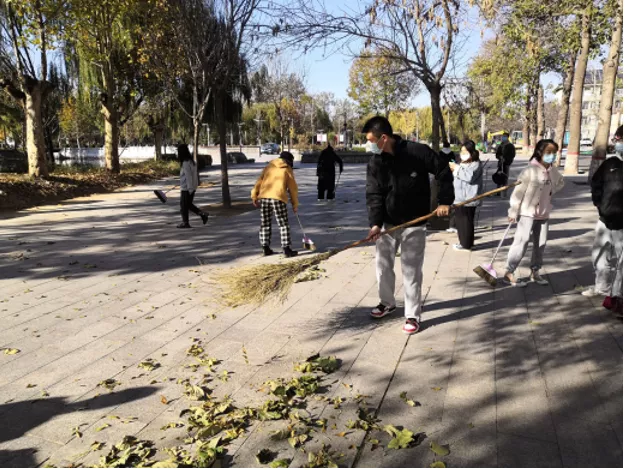 秋冬之间,落叶纷飞,铺满校园的落叶给骑车出行的同学造成了一定的困扰。党支部组织郑明浩、郭文清等同志担起了“校园清洁工”的职责,拿起扫帚行走在校园的各个角落,为道路清洁奉献了自己的一份力量。