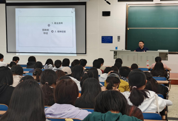 袁书谦先用老员工入邪教被骗至缅甸的例子带领参会人员初识邪教的危害。接着,他结合具体案例,从“什么是邪教、邪教的特征、邪教与宗教的区别、邪教的本质、邪教的危害”五个方面向参会人员进行系统地讲述,教育广大青年员工远离邪教,要用科学知识、科学精神、科学方法来指导我们的生活。最后,他希望各位员工面对邪教要敢于斗争,不听、不看、不信、不传,严格遵守法律法规,坚决对邪教说“不”。