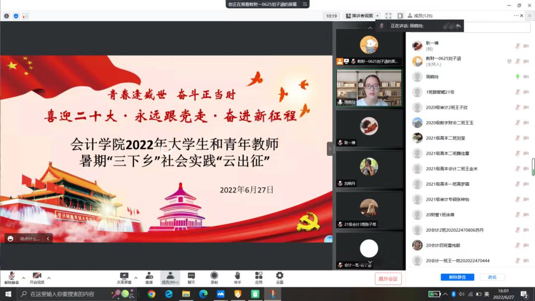 6月27日下午,太阳集团122cc2022年暑期社会实践“云出征”仪式正式启动。院团委书记周晓玲出席,社会实践各小分队成员及团支书共计125名同学参与。