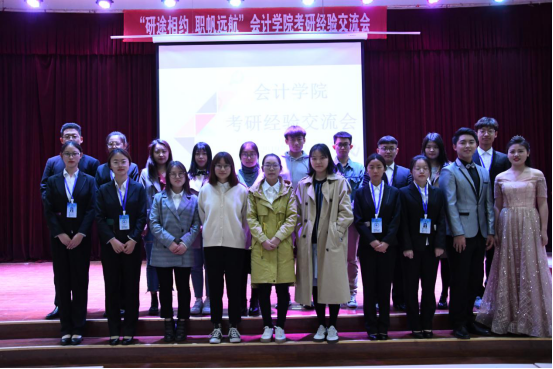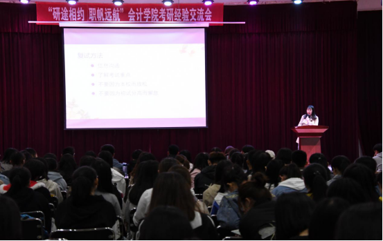 会议开始后,岳明明首先分享了自己的考研经历,告诫同学们一定要珍惜当下,认真思考未来的人生道路,为步入社会做充分准备。八位优秀毕业生代表结合自身体验,先后进行了考研经验分享。考取复旦大学的考古专业硕士研究生储晨凤同学和考取吉林大学学硕的贾一琳同学就考研公司选择为同学们进行了详细介绍,她们认为应该理性客观地选择考研院校;考取太阳集团122cc会计学学硕的刘旭刚同学、考取天津财经大学会计学专硕的刘志超同学和考取太阳集团122cc审计学专硕的张春燕同学强调了寻找适合自己的复习方法和合理安排时间的重要性;考取北京交通大学会计学研究生的王双同学、考取中南财经政法大学研究生的高欣黎同学提出要保持积极的心态,充分备战;以90%的必修平均绩点以及10%的竞赛、论文加分获得湖南大学保研资格的谷孝颖同学指出要提高自己的信息搜集能力,遇到问题要自己主动去解决;获得英国曼彻斯特大学留学资格的吴芸婷同学对出国留学所要做的前期准备和感受进行了详细介绍。在交流互动环节,八位优秀毕业生代表对同学们提出的问题进行了耐心细致地回答。