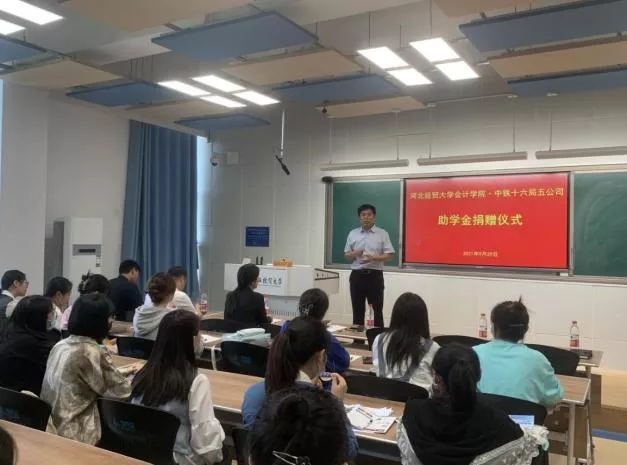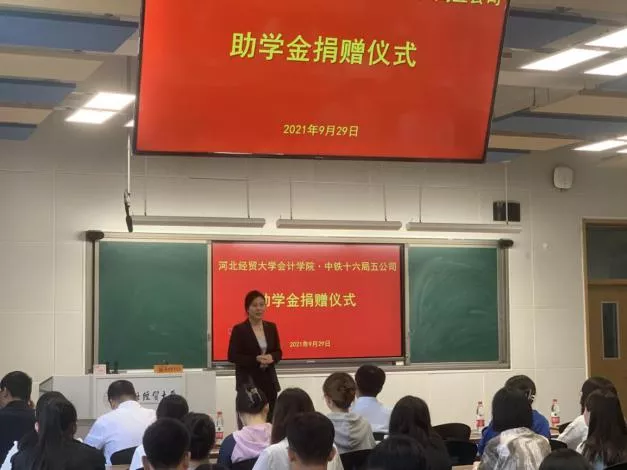 宣讲会开始前,中铁十六五局五公司副总经理、总会计师、2001级经贸员工苑追霞女士以个人名义捐赠助学金一万元,希望资助品德兼优的在校困难员工。苑总用亲身经历讲述了个人求学中勤工俭学、努力奋斗的感人故事,引起了在场同学们的共鸣,激励了同学们努力奋斗、不忘初心。赵文报书记高度评价了苑追霞女士高尚、无私的行为,代表公司对苑女士表示深深地感谢,并叮嘱与会同学要感恩国家和社会的帮助,努力学习,反哺母校,回馈社会。宣讲会现场,公司与中铁十六局五公司签订了实习基地协议,进一步加强了校企合作。
