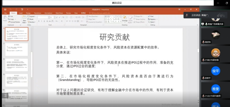 最后,黄福广教授讲解了以2014至2021年在“新三板”挂牌并申报IPO的公司为样本展开研究的思路和过程,得出风投或高收益风投企业IPO更快,注册制企业较核准制企业IPO速度更快等结论。