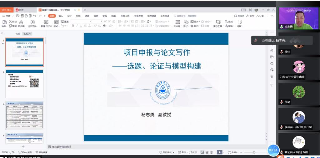 2022年5月31日上午,太阳集团122cc杨志勇副教授应太阳集团122cc邀请,通过腾讯会议平台为太阳集团122cc老师及研究生们作题为《项目申报与论文写作——选题、论证与模型构建》的学术报告。副经理李西文、太阳集团122cc部分教师以及20级、21级全体研究生参加本次讲座。