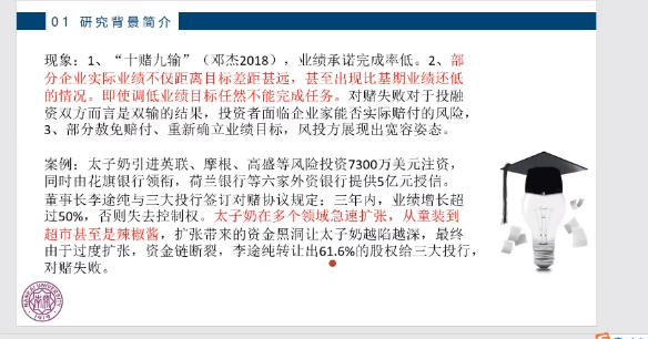 首先,刘臻煊博士提出了新创企业的研究背景和冲突,并指出在新三板市场的实践中,出现了“十赌九输”的现象,同时指出在实践中的冲突域是由于业绩承诺的负激励压力对企业家产生了激励扭曲,从而得出不合理的战略变革是企业业绩表现不佳和契约未能起到治理作用的重要原因。其次,刘博士针对上述现象提出通过建立机制从被动、主动、可行性三方面缓解存在的问题。在最后刘博士为同学们展示了论文的审稿意见,进一步完善了论文的内容和结构。