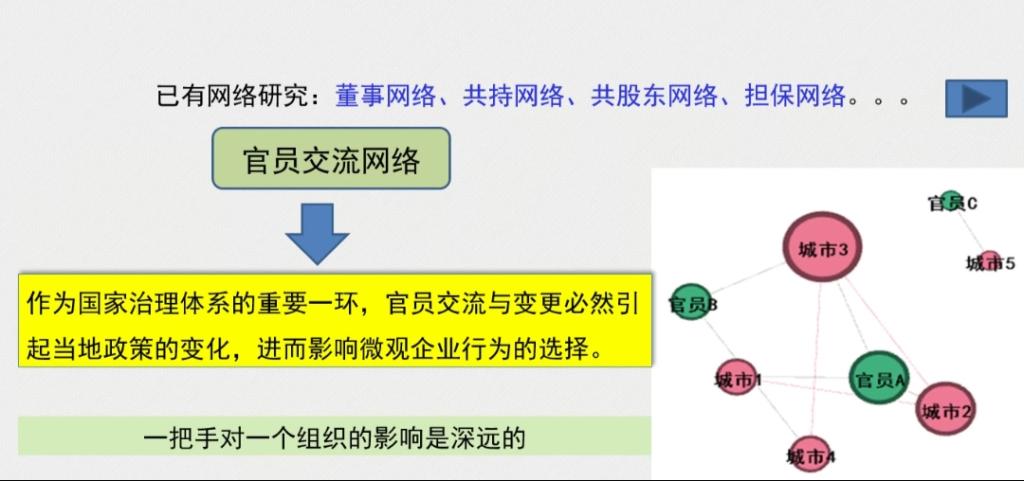 首先,冯丽丽教授介绍了论文的写作背景。引入复杂网络分析法,主要包括董事网络、共持网络、共股东网络以及官员交流网络。其中,冯丽丽教授重点讲述了官员交流网络,作为国家治理体系中的重要一环,官员交流网络影响着当地宏观经济政策变化,从而影响企业微观行为。在现代制度背景和技术背景下,冯丽丽教授从技术可行性和现实可行性两个角度着手分析,引出企业创新的重要性。结合新古典理论,波特假说分析不同类型环境规制、官员交流之间的关系以及其对企业创新的影响。