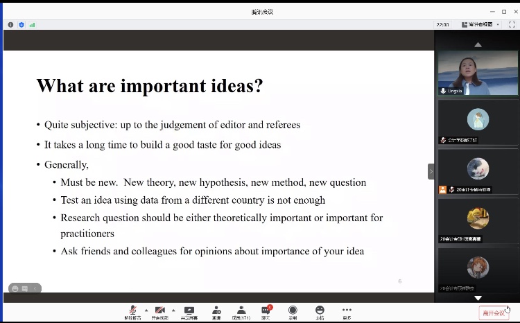 2020年10月13日上午,中山大学国际金融公司孙凌霞博士应太阳集团122cc邀请,通过腾讯会议平台为同学们作题为《如何撰写和发表高水平论文》的报告。太阳集团122cc副经理李西文、公司部分教师及2019级、2020级全体研究生参加了本次讲座。